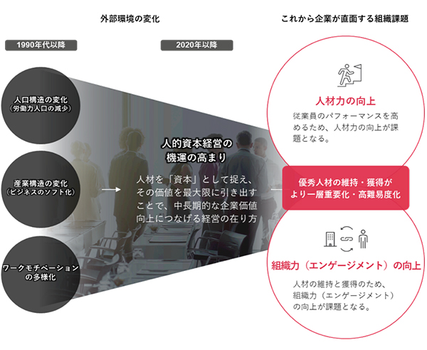 現在、労働人口の減少やビジネスのソフト化、ワークモチベーションの多様化など、環境変化は想像を超えるスピードで進んでいます。人的資本経営への注目はますます高まっており、組織人事の領域に長年身を置いてきた私にとっては「ようやく時代が追いついてきた」との実感とともに、「当社にとって大きな追い風である」と捉えています。
