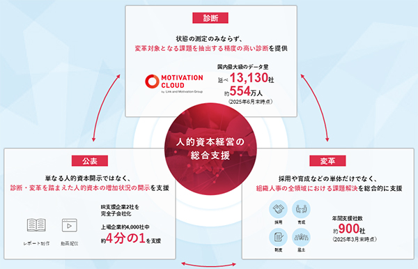 当社は、独自の基幹技術「モチベーションエンジニアリング」を用いて、組織課題の「診断」、課題の「変革」、結果の「公表」を通じて、企業の「人的資本経営」を総合的に支援しております。これらすべての領域を網羅し、企業の人的資本経営を総合的に支える点こそが、当社の揺るぎない競争優位性です。