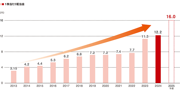 当社は、株主の皆さまへの利益還元を経営の重要課題の一つとして位置づけています。機動的な還元を可能とする四半期配当を実施し、これまで業績に応じた増配を重ねてまいりました。今後も、コンサルティング事業・クラウド事業においてM&Aや事業提携などの投資を積極的に推進するとともに、株主の皆さまへの一層の還元を実現してまいります。