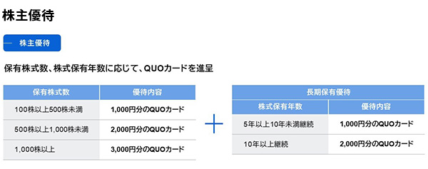 | 優待のポイント | 株主への日頃の感謝とし、保有株式数・保有年数に応じたQUOカードを進呈。100株以上で1,000円分、長期保有優遇で最大5,000円分を進呈。 |