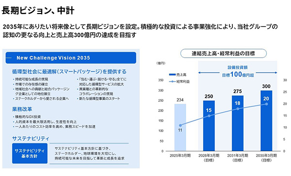 創業100周年を機に、グループビジョンおよび長期ビジョン「New Challenge Vision 2035」を新たに策定いたしました。グループビジョンでは、パーパス「未来を包む - Inclusion for Future -」を掲げ、「循環型社会に最適解を提供する」ことをビジョンとして定めております。単にモノを「包む」ことに留まらず、循環型社会において最適なソリューションを提供することにより、持続可能な未来の実現に貢献してまいります。