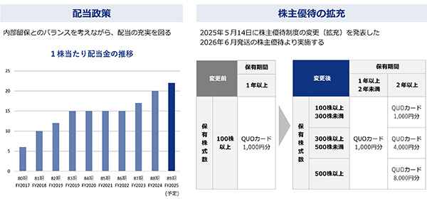 また、2025年5月には株主優待制度の変更(拡充)を発表しました。変更後は、保有株式数及び保有期間に応じてQUOカードを進呈します。保有期間1年以上2年未満はQUOカード1,000円分、保有期間2年以上で、100株以上300株未満は1,000円分、300株以上500株未満は4,000円分、500株以上は8,000円分となります。今後も株主の皆様への還元の更なる充実を図ってまいります。