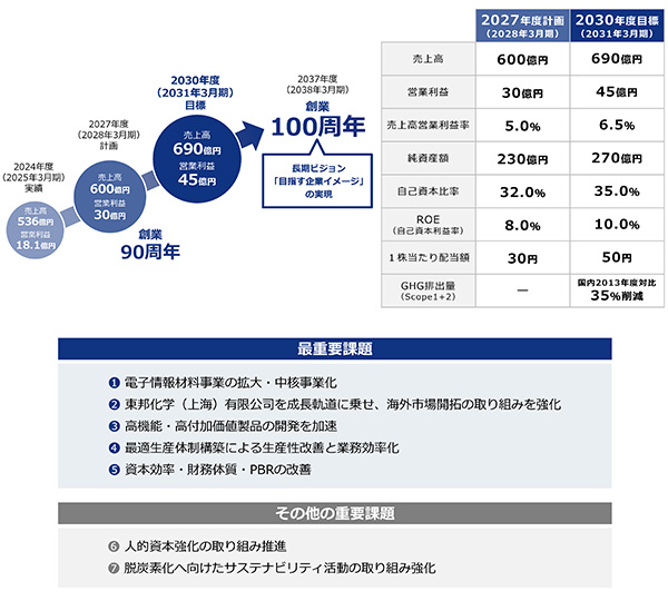 更に、創業100周年を視野に入れ、本中計最終年度から3年後の2030年度目標を設定しました。売上高690億円、営業利益45億円、売上高営業利益率6.5%、純資産額270億円、自己資本比率35.0%、ROE10.0%、1株当たり配当額50円を目標としています。