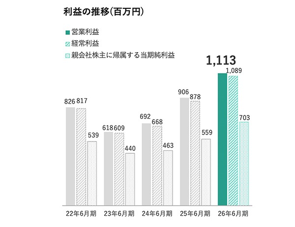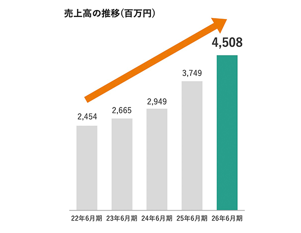 当社はこれまで毎期、着実に成長を続けており、直近5期間において売上高は右肩上がりに成長しております。また、2025年6月期には営業利益・経常利益・親会社株主に帰属する当期純利益において、過去最高益を更新するなど、収益性の向上にも取り組んでおります。 2026年6月期の業績予想としては、連結売上高は45億800万円、連結営業利益は11億1,300万円を計画しており、今期も増収増益となる見通しです。
