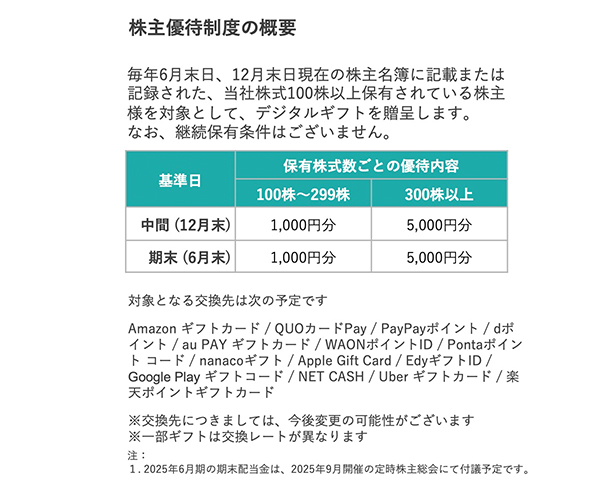 優待の内容については、100株以上保有の株主さまにデジタルギフト1,000円分、300株以上保有の株主さまにデジタルギフト5,000円分を贈呈するものとしています。これにより、株主のみなさまへの感謝を形にするとともに、当社株式の課題である認知度や流動性の改善・向上につなげていきたいと考えています。