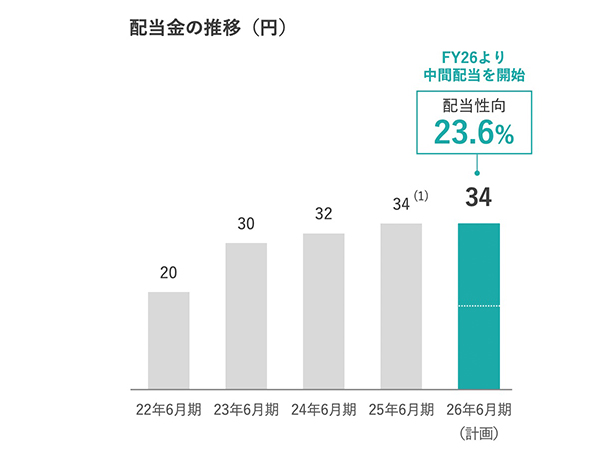 また、優待制度に加え、当社では上場以来、毎期配当を実施しています。直近の業績や事業環境を踏まえ、2026年6月期は中間配当17円、期末配当17円の年間配当34円(配当性向23.6%)を計画しています。当社は依然としてトップラインの拡大を追求する成長段階にあります。そのため、事業成長に向けた積極的な投資が必要ではありますが、並行して、株主のみなさまへの還元にも努めてまいります。
