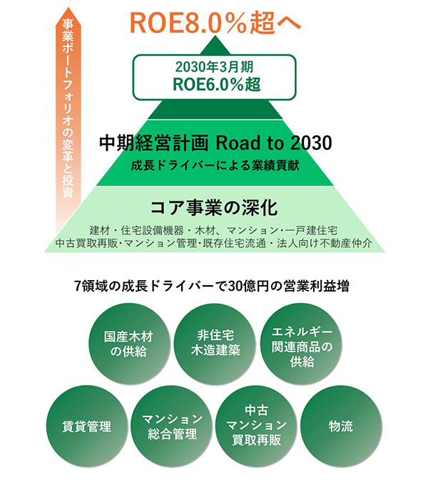あわせて、DXによる業務効率化や人的資本経営の推進を通じて、持続的な利益成長と資本効率の向上を図るとともに、適切な利益配分を通じて株主の皆様への還元拡充に努めてまいります。