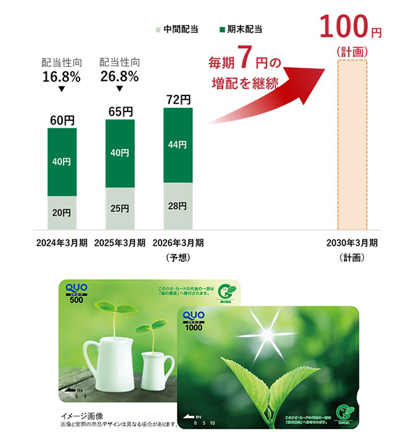 また、「中期経営計画Road to 2030」の期間中は、毎期7円の増配を継続し、2030年3月期には1株当たり100円を配当することを計画しています。
