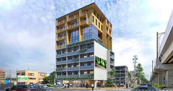 国産木材の利活用の促進に向けた新たな取り組みとして、現在、木造ハイブリッド免震マンションの開発を進めています。この建物は、下層階(1~5階)を鉄筋コンクリート造、上層階(6~9階)を木造とするハイブリッド構造を採用いたしました。