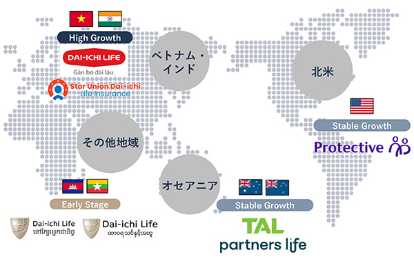 海外保険事業では、北米等の先進国における安定市場、アジアパシフィック地域におけるインド等の成長市場、長期的な拡大が見込めるアーリーステージの新興国市場と、事業ステージの異なる市場にバランスよく進出しています。